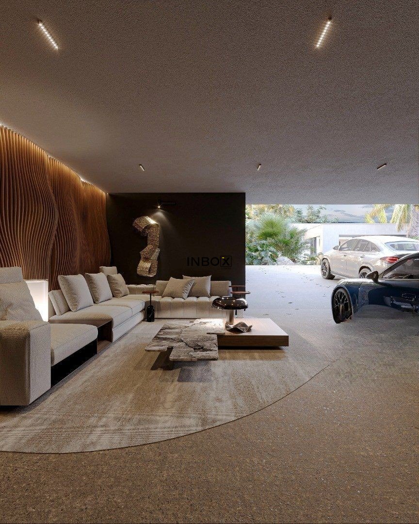 No pavimento inferior, a garagem possui seis vagas, sendo três cobertas e três descobertas. Também conta com carregador para carro elétrico e uma área especial chamada "Men?s Cave", com aproximadamente dezesseis metros quadrados. Este ambiente pode ser adaptado como sala de jogos, oficina, adega ou charutaria. O acesso à residência pode ser feito por escada com claraboia ou pelo elevador.