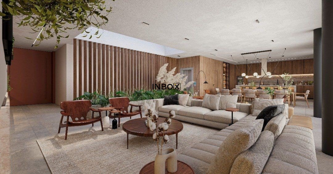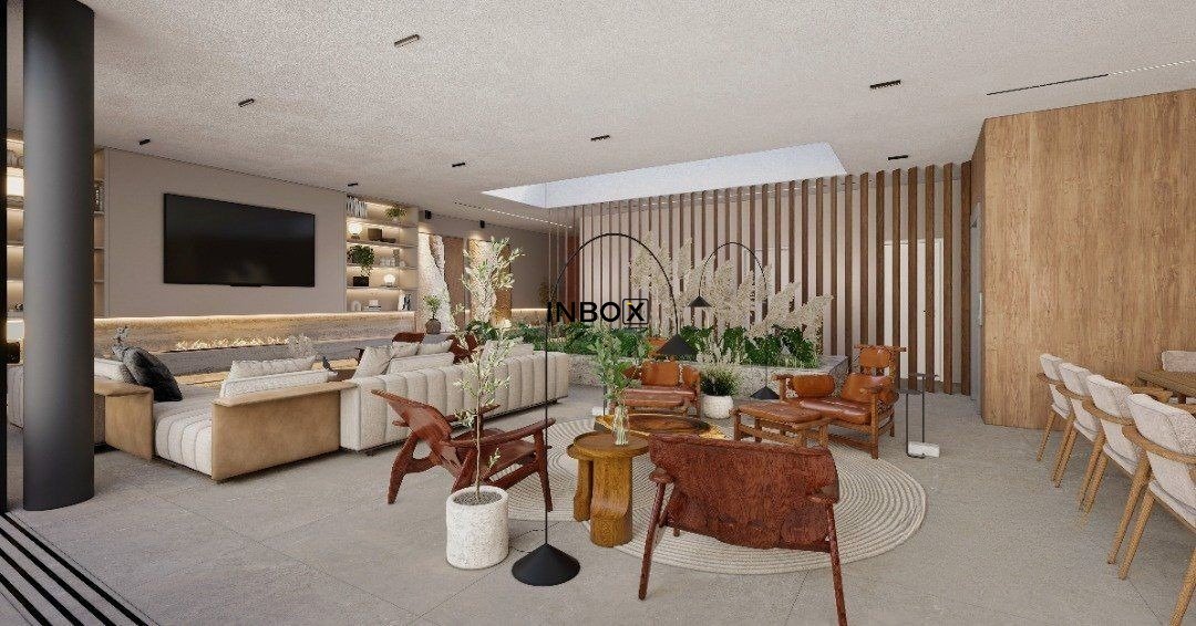 O amplo living possui cem metros quadrados e pé-direito elevado, abrigando estar, jantar, espaço para adega vertical com capacidade para cem garrafas e uma cozinha integrada em conceito aberto. As grandes aberturas possibilitam a total integração com a área externa da piscina e varanda.