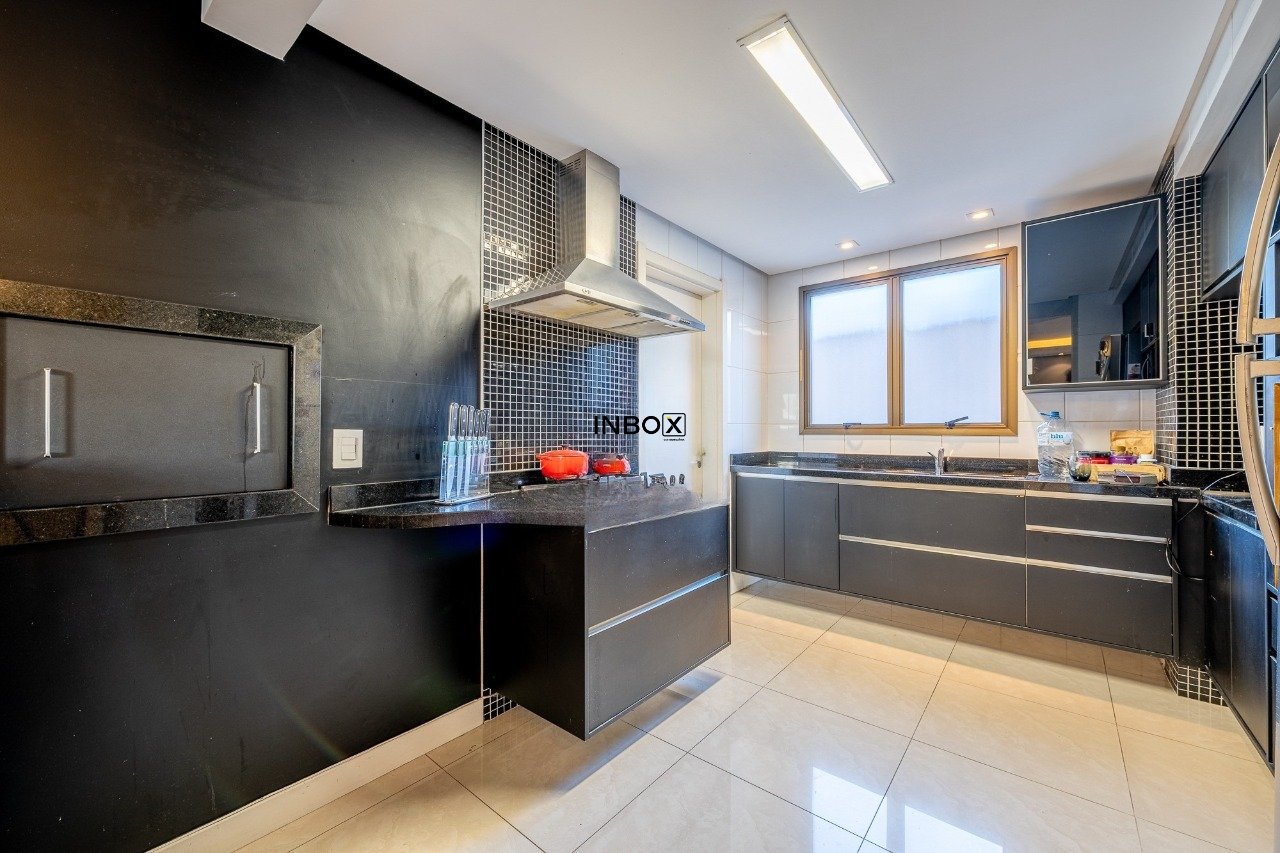 A cozinha é planejada, com churrasqueira integrada, e conecta-se à área de serviço com lavanderia e banheiro auxiliar independentes. O projeto privilegia a integração dos espaços e a funcionalidade, sem abrir mão do bom gosto.