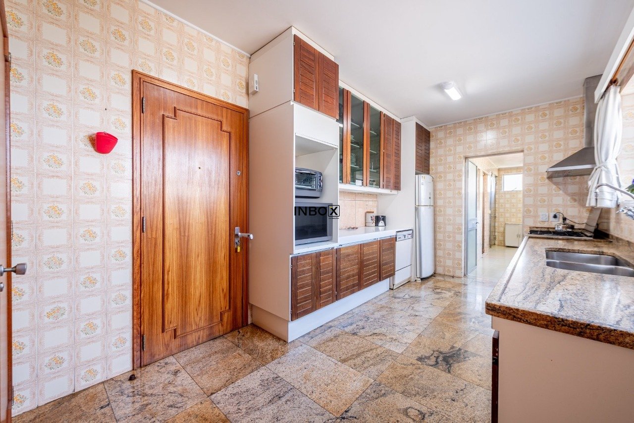 São 3 amplos dormitórios, suíte máster enorme, dormitórios grandes, banheiro social e lavabo. Área social enorme com vista e sol junto à uma enorme sacada e um escritório montado em anexo. Como diferencial um outro ambiente também generoso com sala de jantar e estar íntimo junto à cozinha que conta com apoio de uma área de serviço separada e independente e uma dependência completa de empregada. Na garagem, a praticidade e segurança de 2 vagas cobertas e individuais amparadas por uma segurança presencial 24 horas e a facilidade de um estacionamento para visitantes.