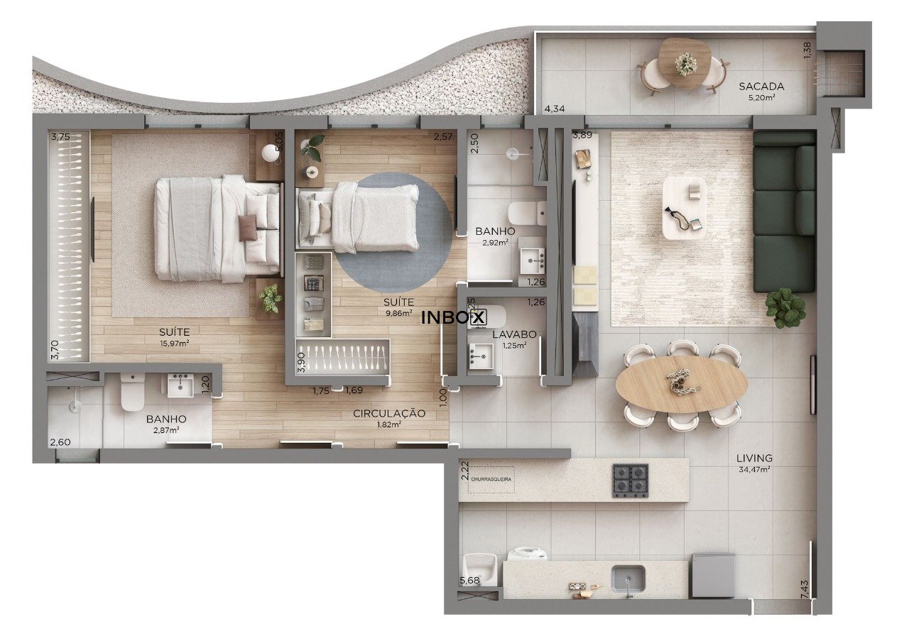 Dois quartos, sendo 2 suítes, lavabo social, cozinha e área de serviços independentes, sala de estar e uma linda sacada com churrasqueira completam a beleza desse apartamento.