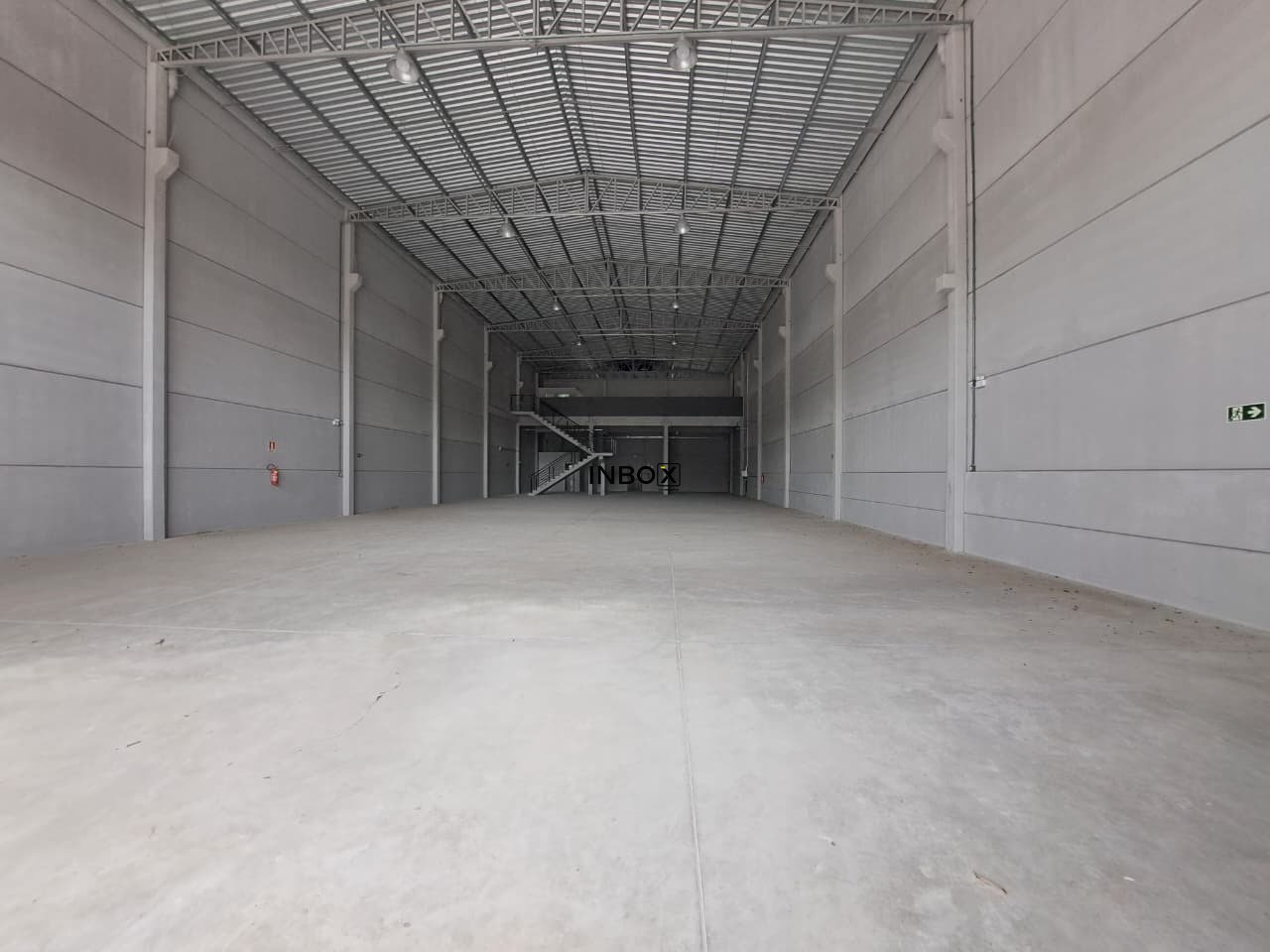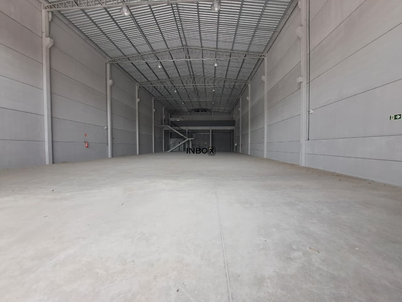 Pavilhão com pé direito alto e mezanino, que possibilita comportar a parte administrativa de sua empresa.