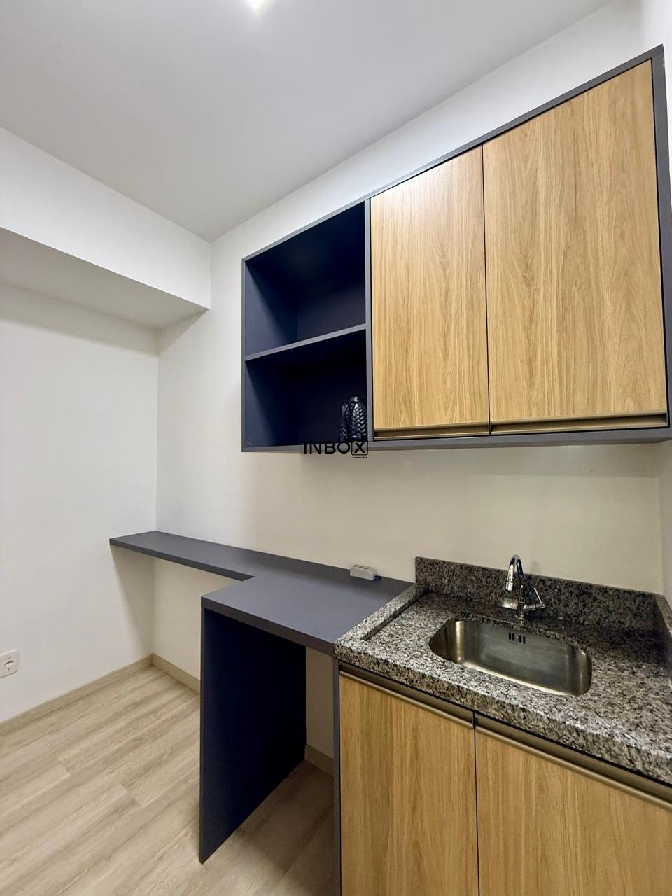 Sala comercial dividida em dois ambientes com 3 banheiros e cozinha com móveis fixos.