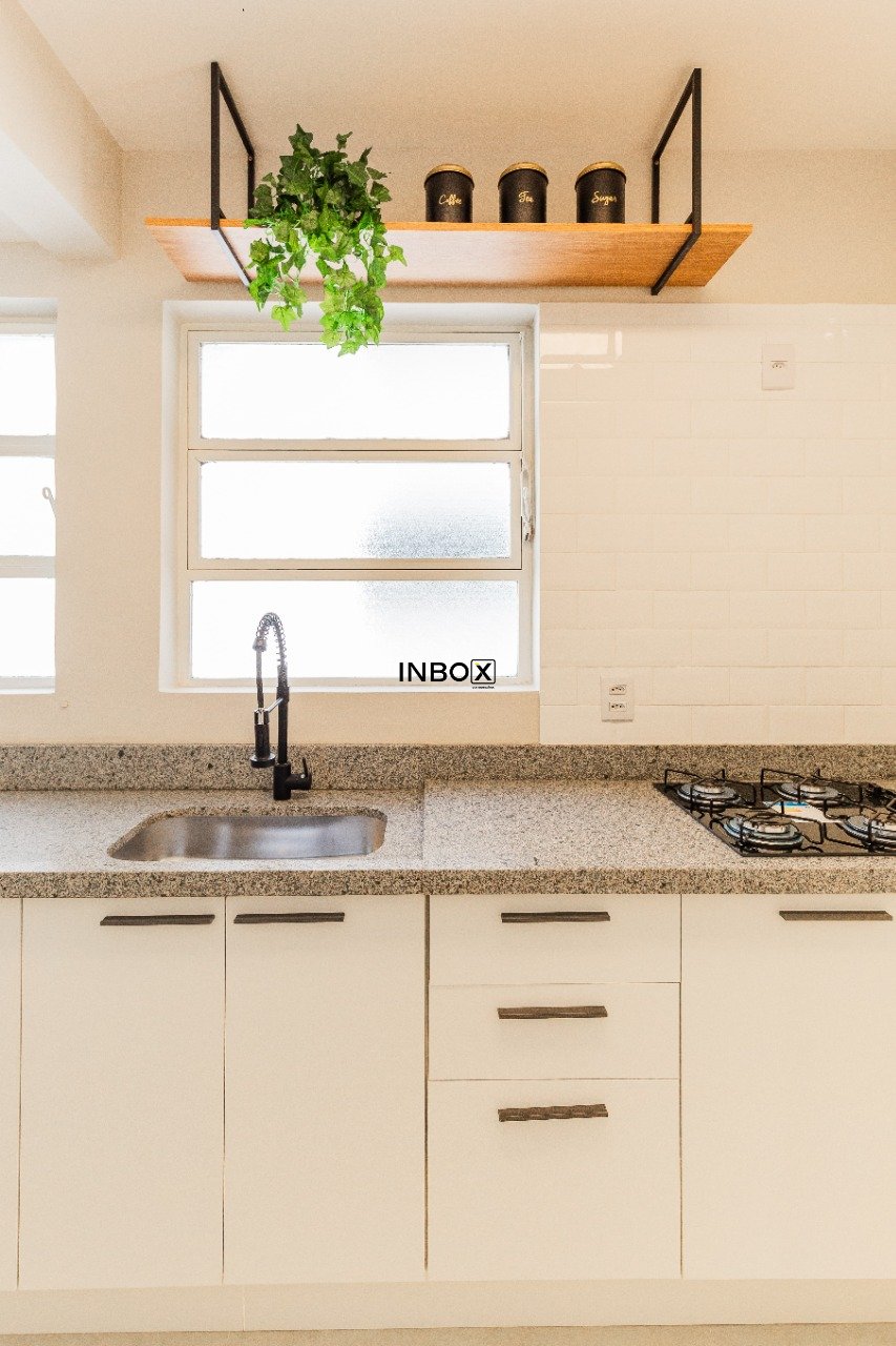 A cozinha é espaçosa, com bancada funcional e excelente aproveitamento de espaço. O banheiro é moderno, com ótimo padrão de acabamento, proporcionando um ambiente atualizado e de bom gosto.