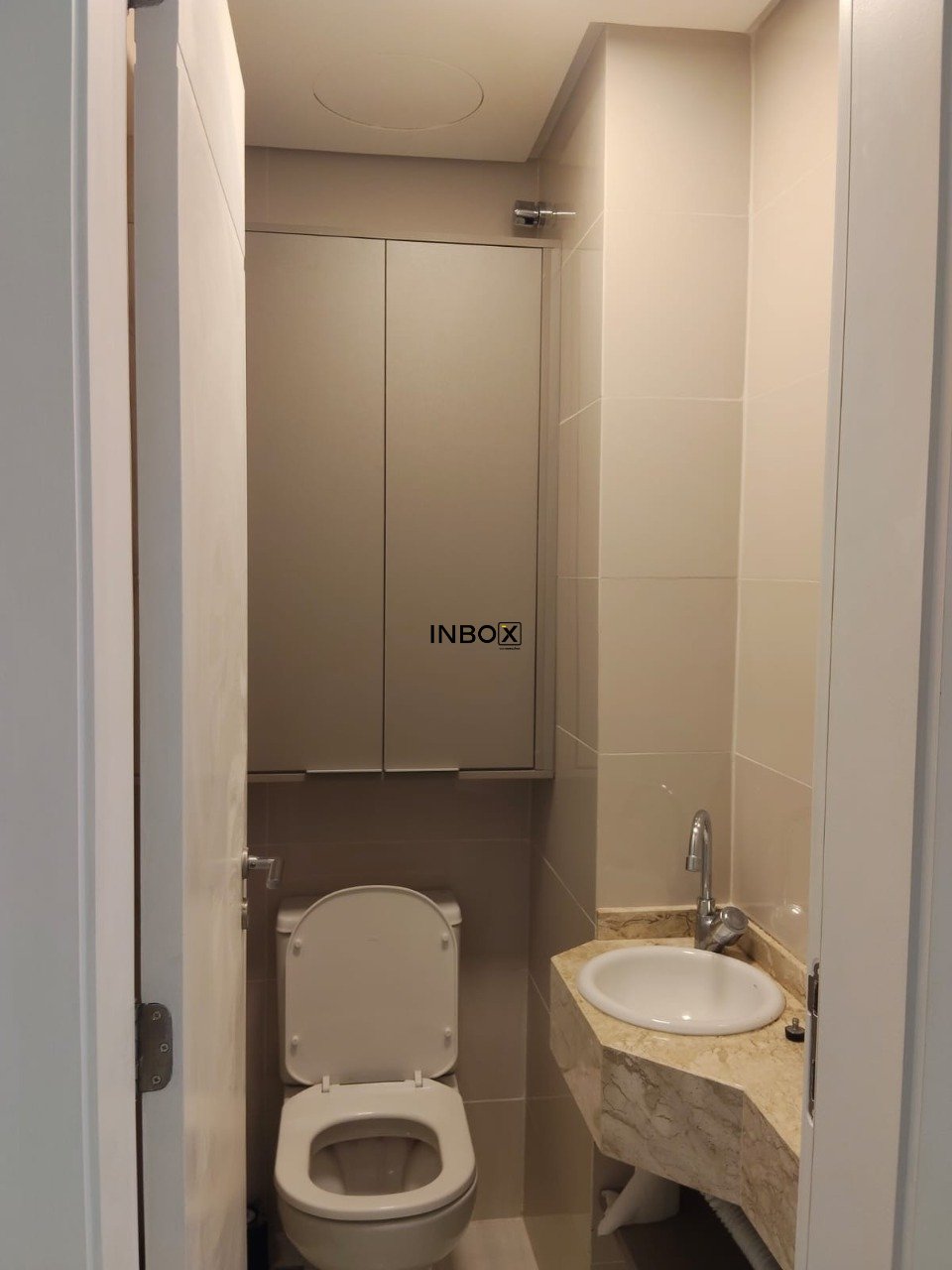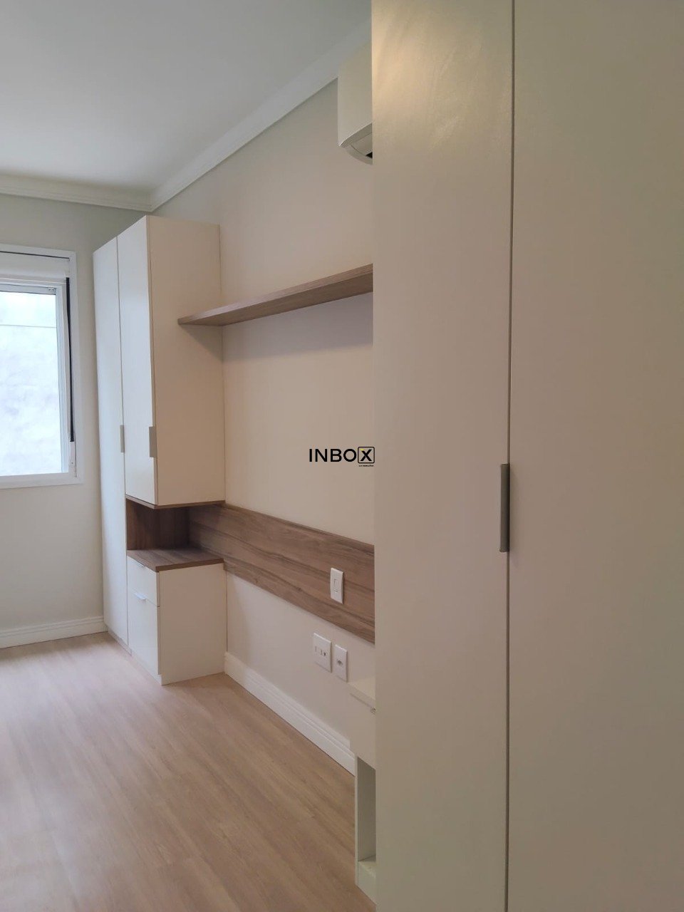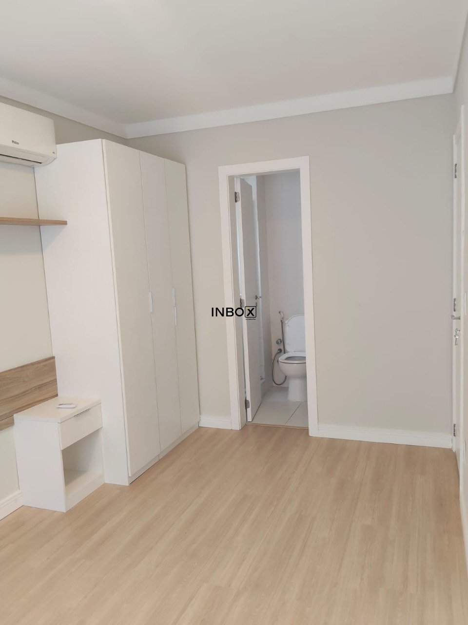 Na suíte, mais um split e um grande armário sob medida com mesas de cabeceira também integradas .No banheiro do quarto além de ventilação natural temos um box de vidro e mais um gabinete montado, tudo novinho !