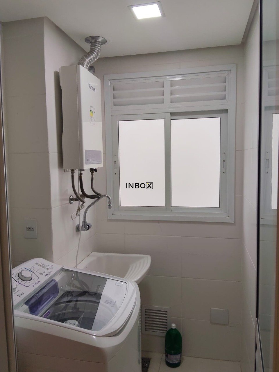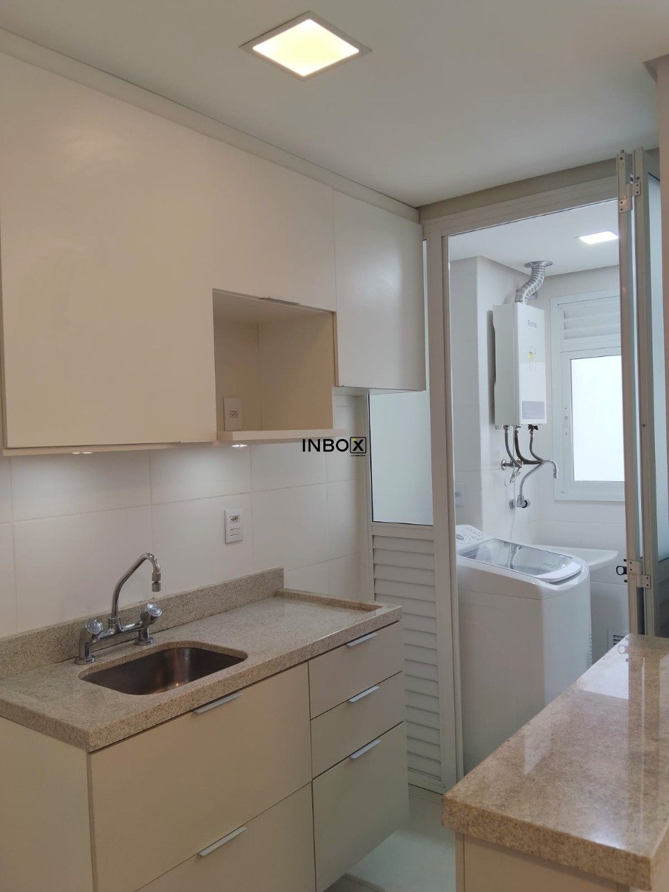 Imóvel conta com cozinha montada, cozinha americana com bancada feita sob medida por arquiteta e maquina lava e seca na área de serviço. Na sala, painel rack de TV, split,, armário e um lavabo montado com gabinete e mais armários.
