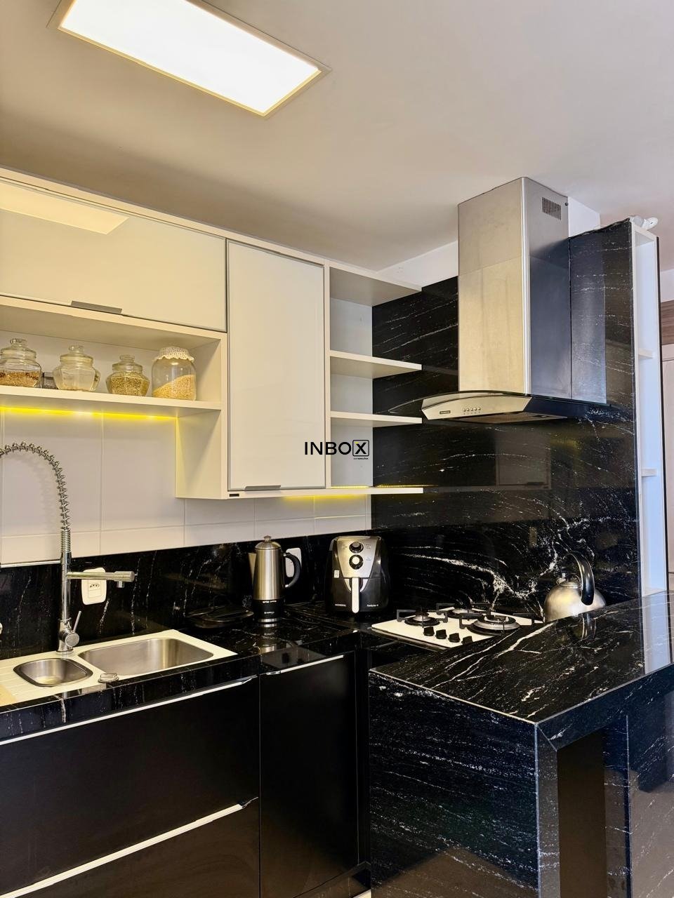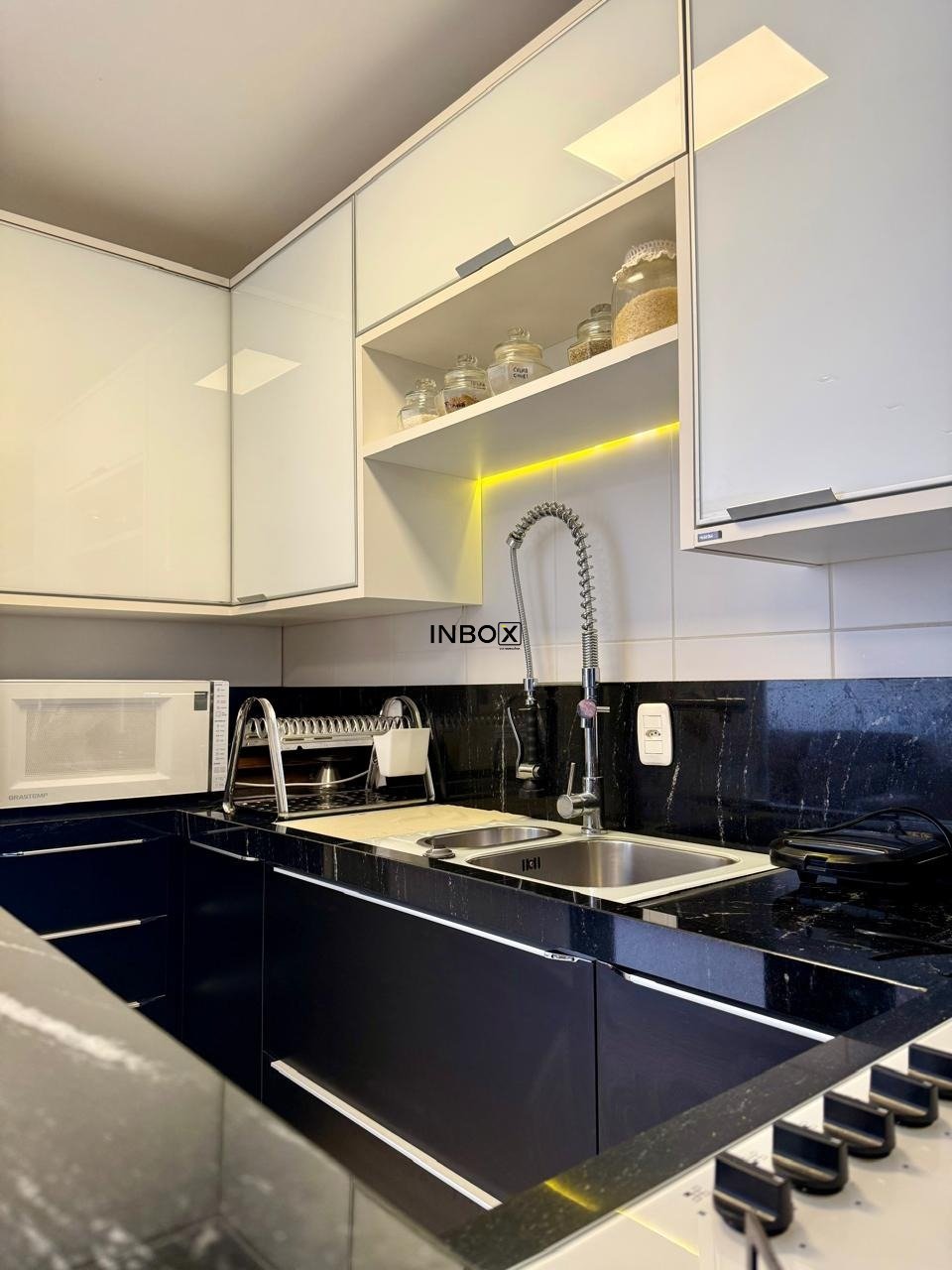- Cozinha e área de serviços e com móveis e eletrodomésticos