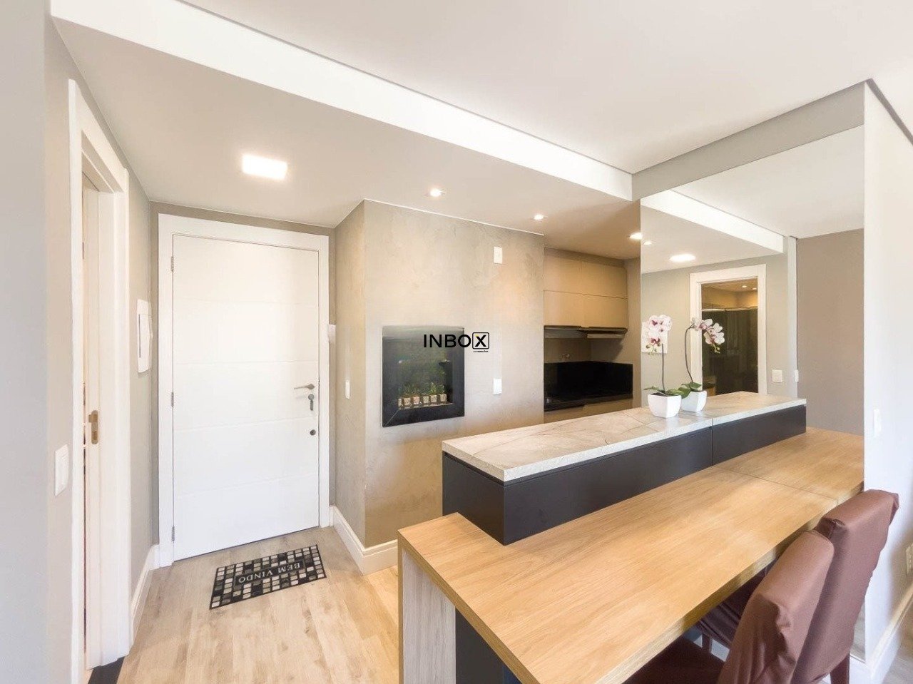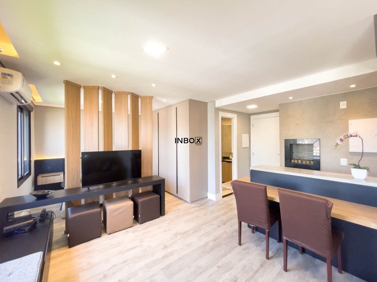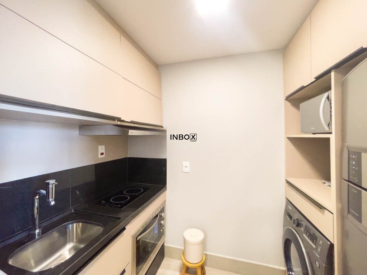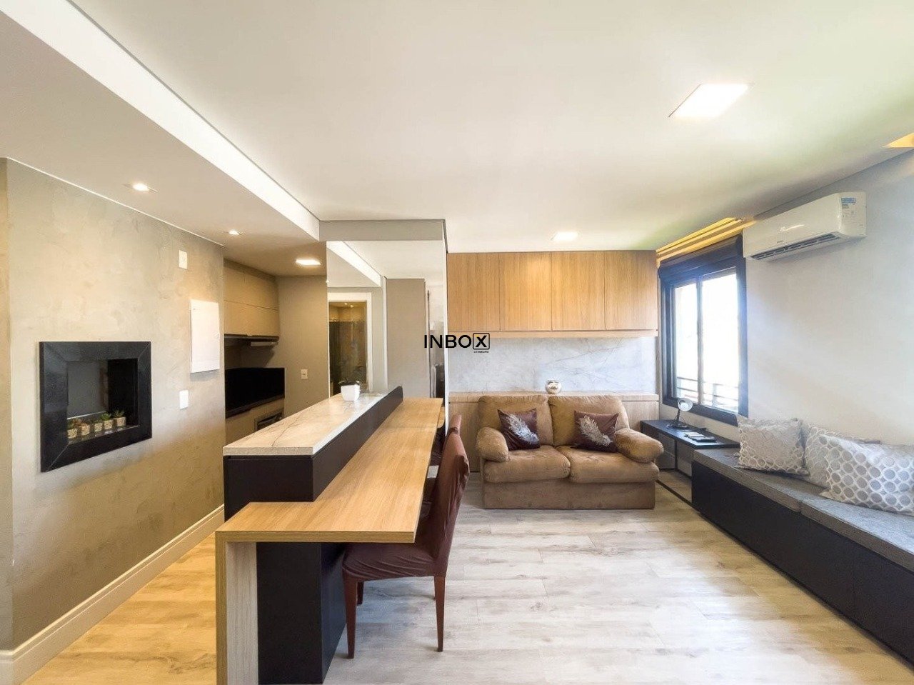 INBOX CIA IMOBILIARIA ALUGA Este apartamento conta com 44m² de área privativa e se destaca pelo excelente aproveitamento dos espaços e pelo cuidado nos detalhes. O living é acolhedor e funcional, mobiliado com sofá, armário e split, criando um ambiente confortável tanto para relaxar quanto para receber visitas. A cozinha apresenta um design moderno e prático, equipada com pia, armários, fogão por indução e churrasqueira, ideal para quem valoriza praticidade no dia a dia sem abrir mão de bons momentos à mesa.