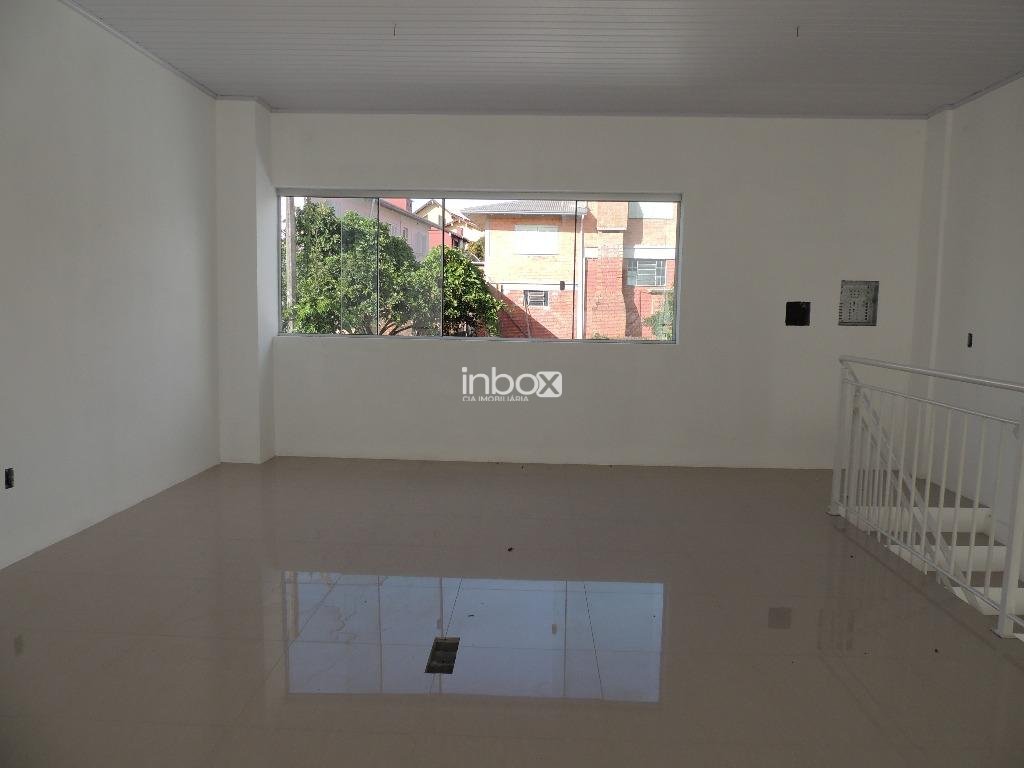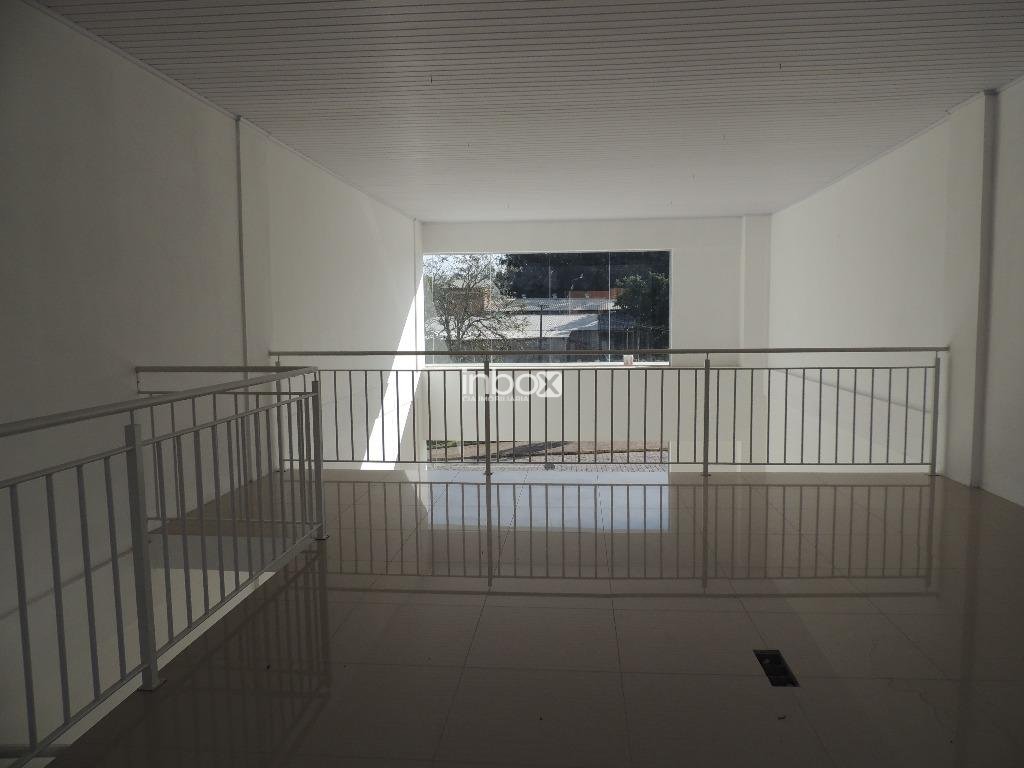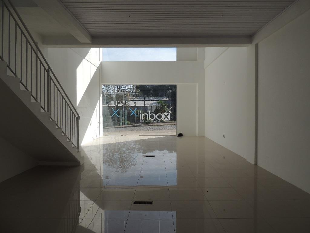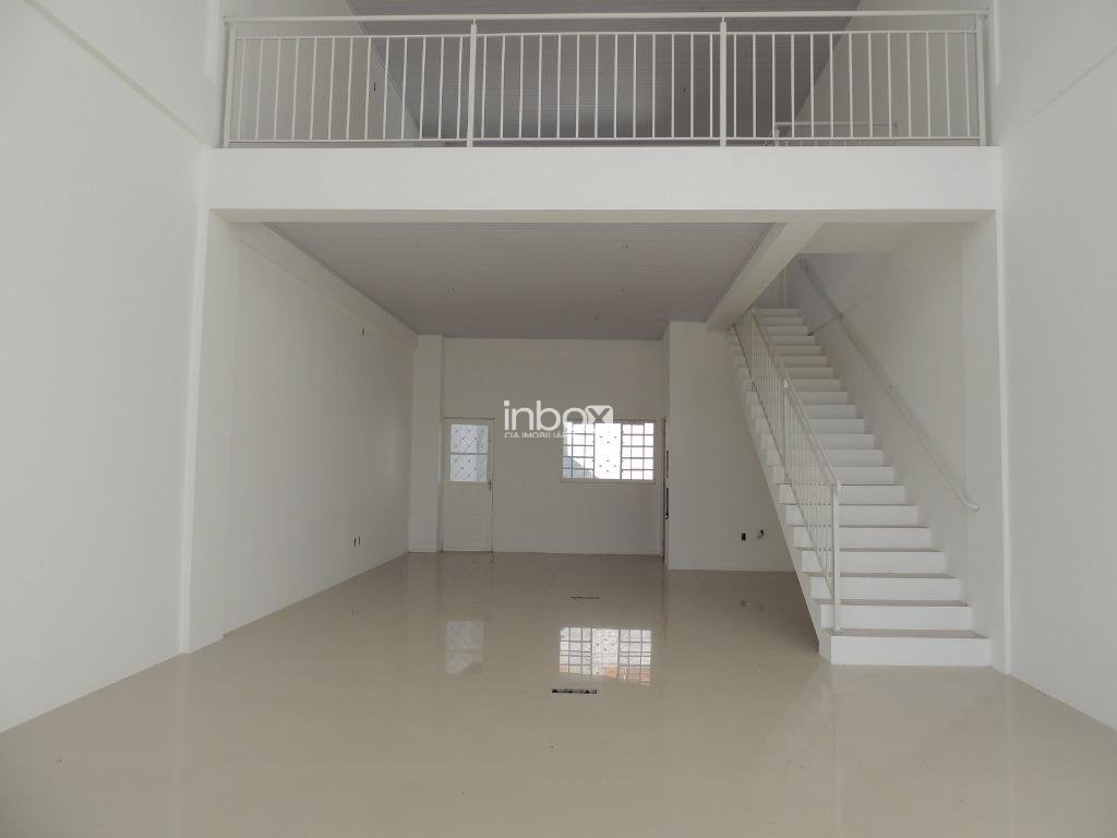 Sala com pé direito duplo, piso porcelanato, mezanino com corrimão, vitrines com vidros temperados, banheiro vagas de estacionamento em frente à sala.